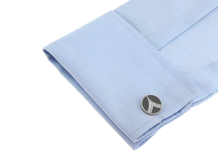 • 圆形 人字 白色水钻 黑色烤漆 镀白钢 袖扣 袖钉 140437