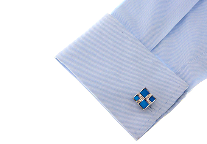 • 正方形 白色水钻 蓝色烤漆 镀白钢 袖扣 袖钉160068