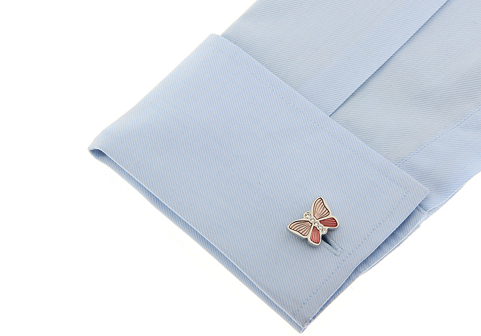 • 昆虫 蝴蝶 粉色 烤漆 白色水钻 镀白钢 袖扣 袖钉 161590