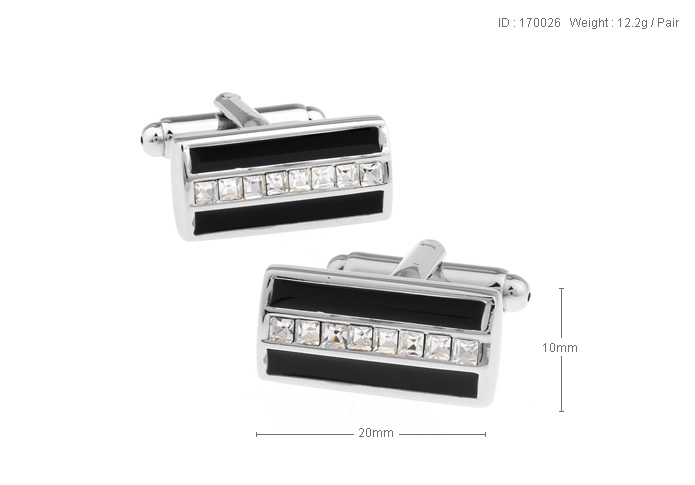 • 长方弧形 双排凹槽黑色 烤漆 横排并列8颗白色方钻 镀白钢 袖扣 袖钉170026