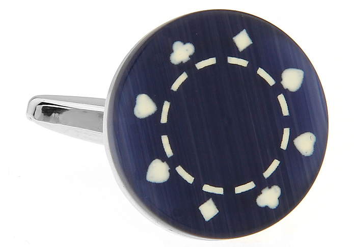 • 圆形 墨兰色猫眼石 印刷 扑克4花 黑桃 红桃 梅花 方块 镀白钢 袖扣 袖釘210098